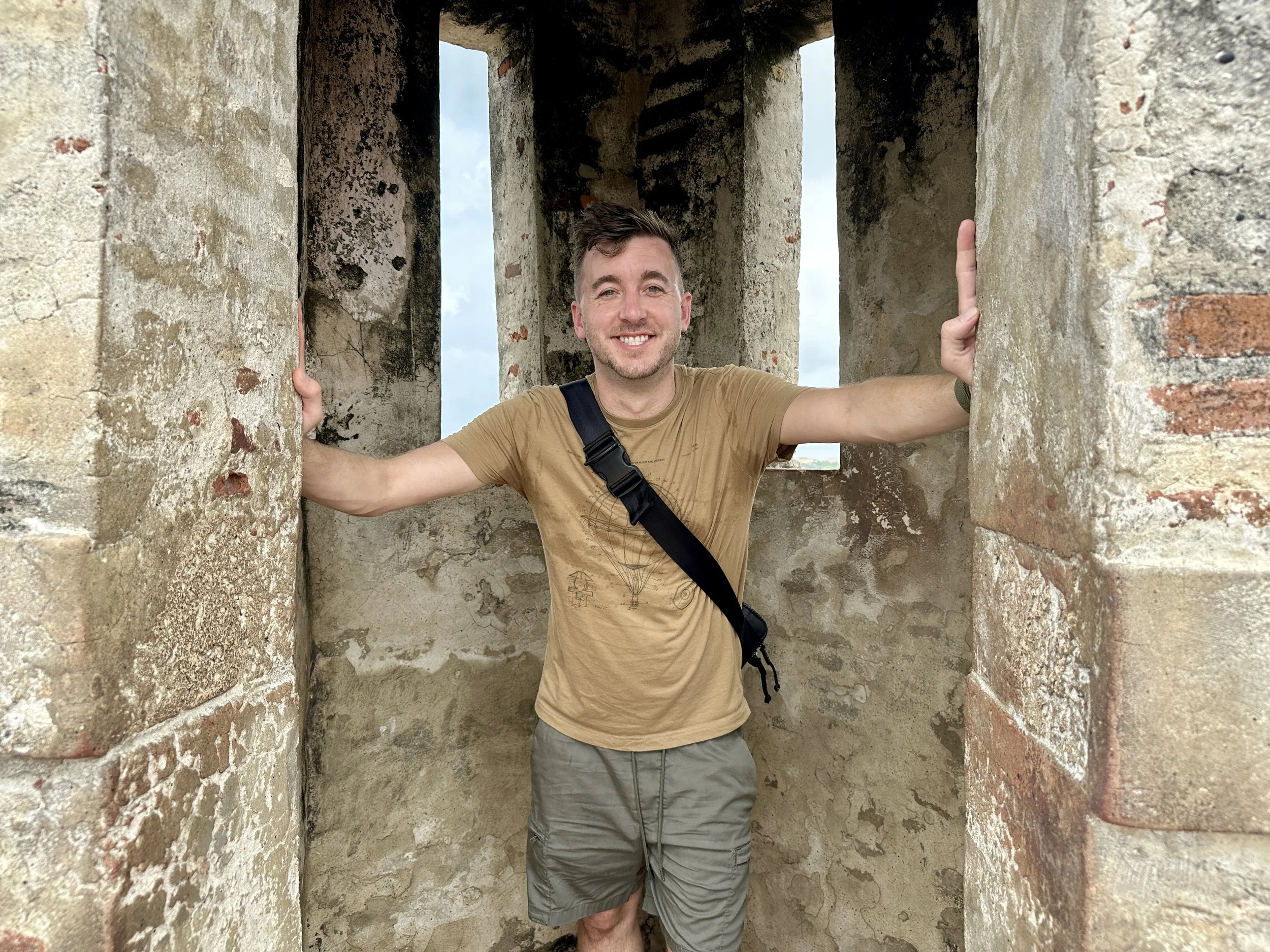 Afterward, we set off to begin exploring the city. We walked up and down the streets for a bit and then stopped at Las Bovedas in the Old City. It was an old jail that they turned into gift shops. With it being hot, we decided to jump in an Uber and go to Castillo San Felipe de Barajas. Right before we went to the castle, at the street light, a street performer built a tightrope and proceeded to walk across it while the light was red. I had seen similar performers in Panama, but it was exciting to see. Later on the trip, I saw a guy juggling knives at a traffic light, which is a tad scarier for those waiting for the light to turn green.