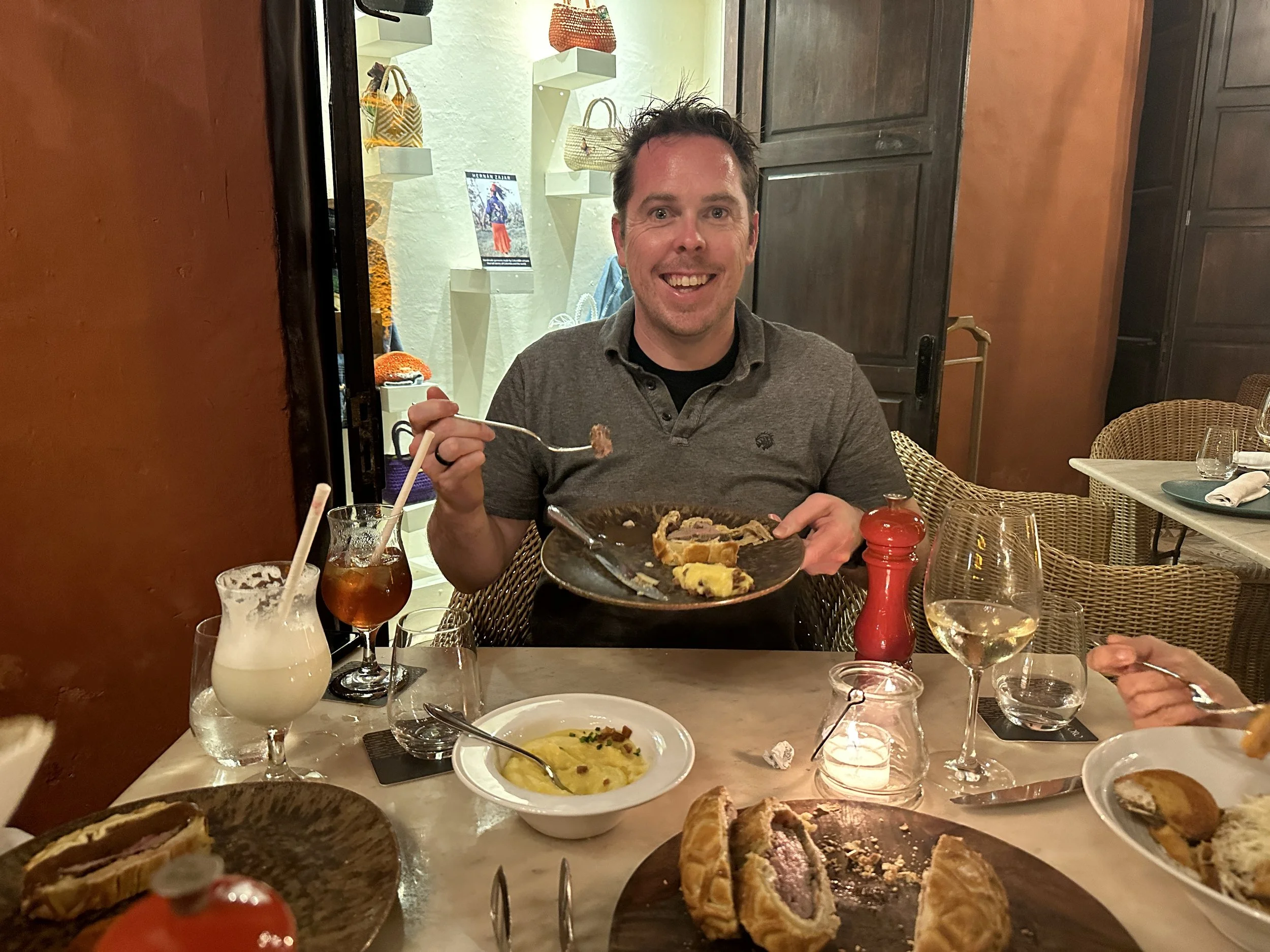 The hotel was about an hour away. We drove around the potholes, back over the connecting bridge, near a few tourist spots, and then back to Hotel Quadrafolio. Restaurants don’t open up until around 6:30 pm so we just laid around the room and relaxed until then. We got cleaned up for dinner at the Sofitel. We attempted to eat at a place called 1612, but they didn’t have any availability so we ate at their sister restaurant called Jardin. Grant was in heaven because they had Beef Wellington, an English dish, which was the most random dish to find in Cartagena. He was thrilled and there was no persuading him about any other option. The food was a bit slow to come out in Colombia and tie that with a notoriously slow dish— we were there for a long while. But while we were waiting we got to catch a surprise fireworks show. The food was good and most importantly Grant was happy that he got the beach and Beef Wellington all in one day!