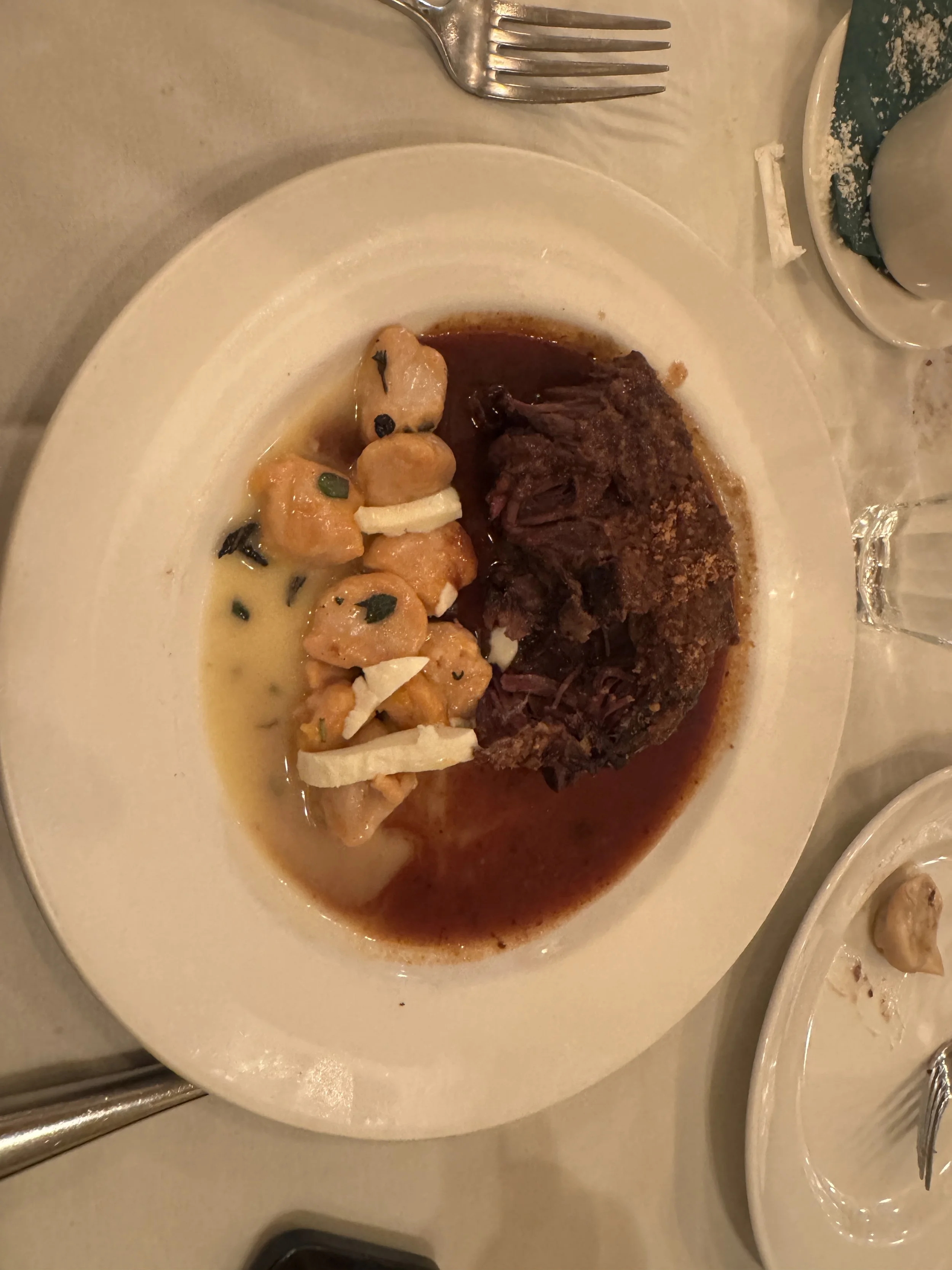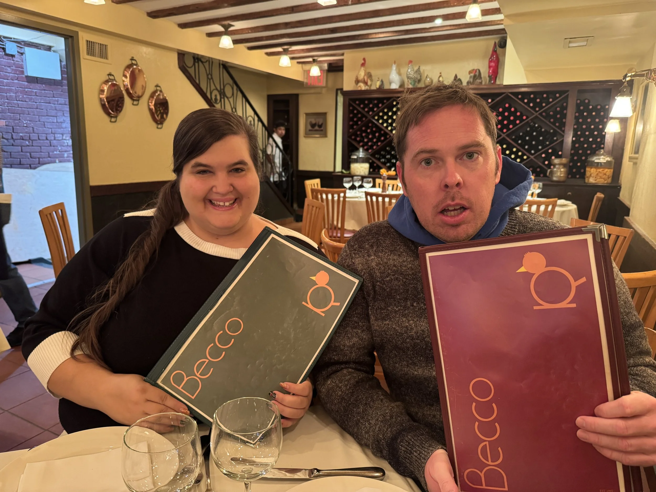 Before the shows, we needed to eat—anything but pizza. Last year, I found Becco, an Italian restaurant in the Times Square area that serves great food. We went again, and it lived up to the memory. Their speck with polenta is delicious, albeit lacking any nutrition. We ordered the short rib and it was okay. Emily was brilliant and ordered the chicken, which was delicious. She also ordered a round of pasta, which allowed her to sample the three kinds of pasta of the day. We unabashedly ate some of her pasta off her plate as we were utterly envious.