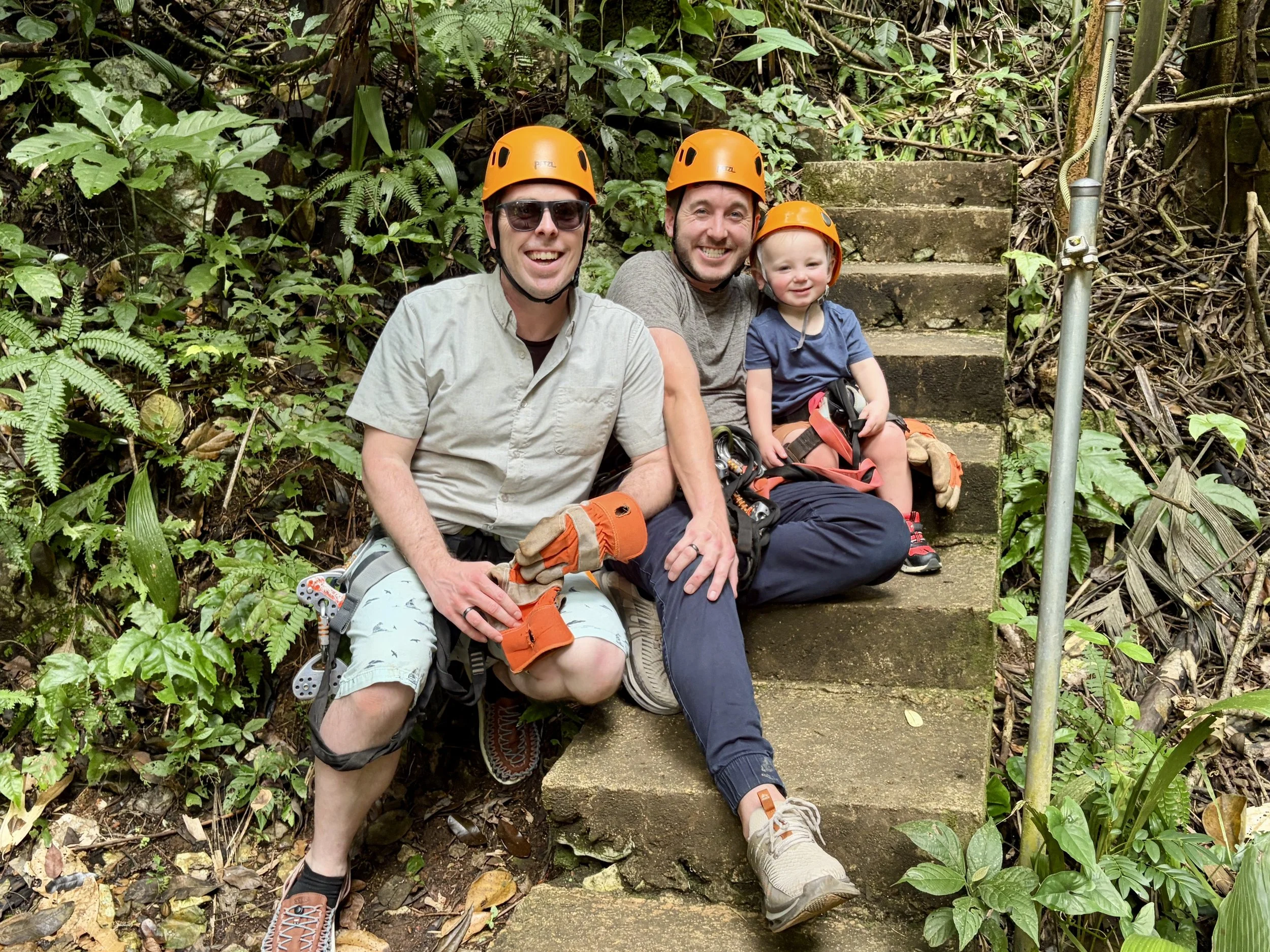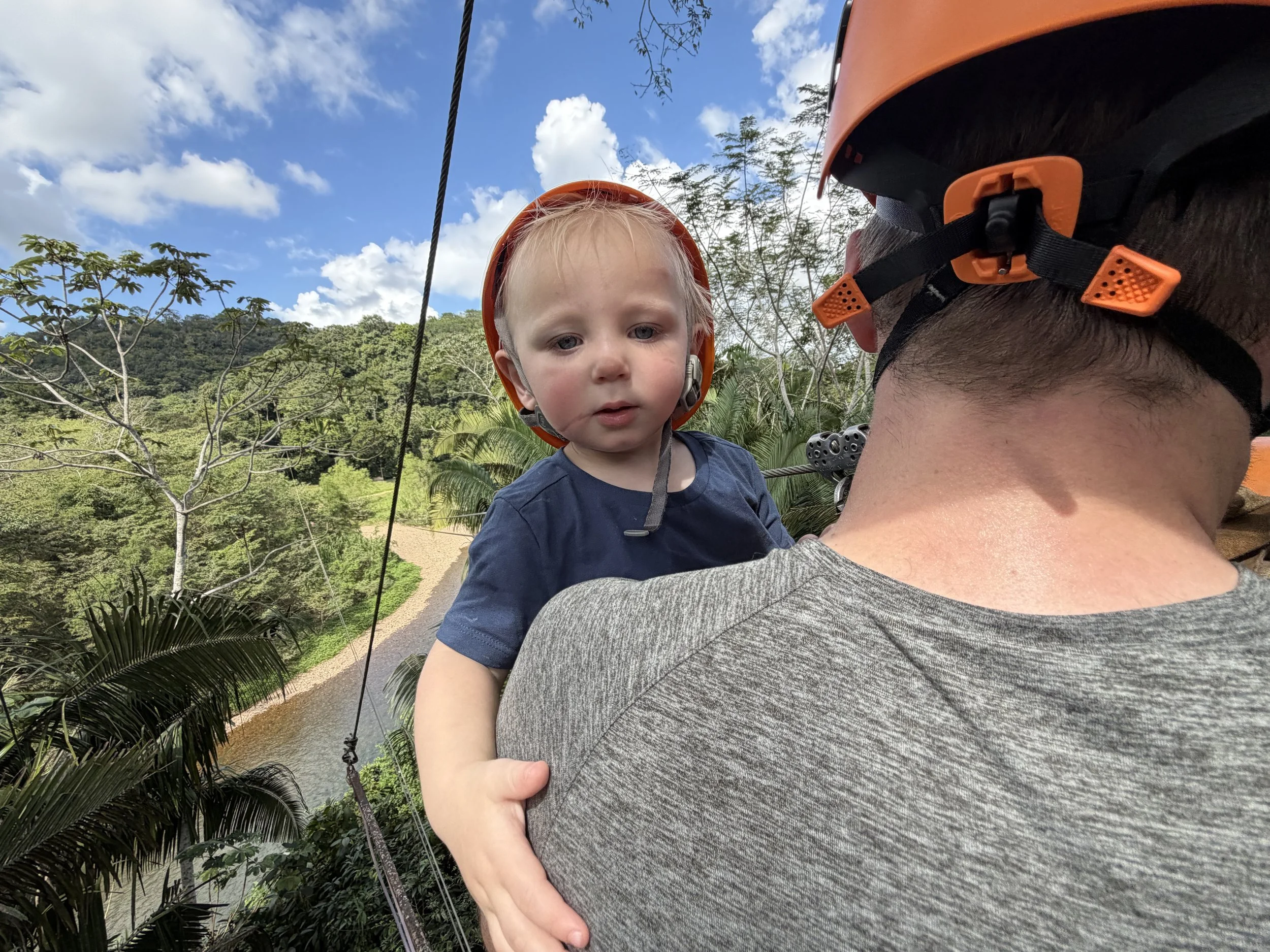 At the zipline site, Ripley became obsessed with a cat. We wouldn’t let him touch it due to disease concerns—which is hilarious considering we’d just let him pet a tapir. Harnesses and helmets followed. He despised the helmet. The guides cleverly told him it was “for the monkeys,” which somehow worked. After climbing what felt like the equivalent of the Empire State Building (Belize loves stairs), we zipped. Ripley was clipped to me, we launched, and he immediately yelled “WEEE!” in pure joy.