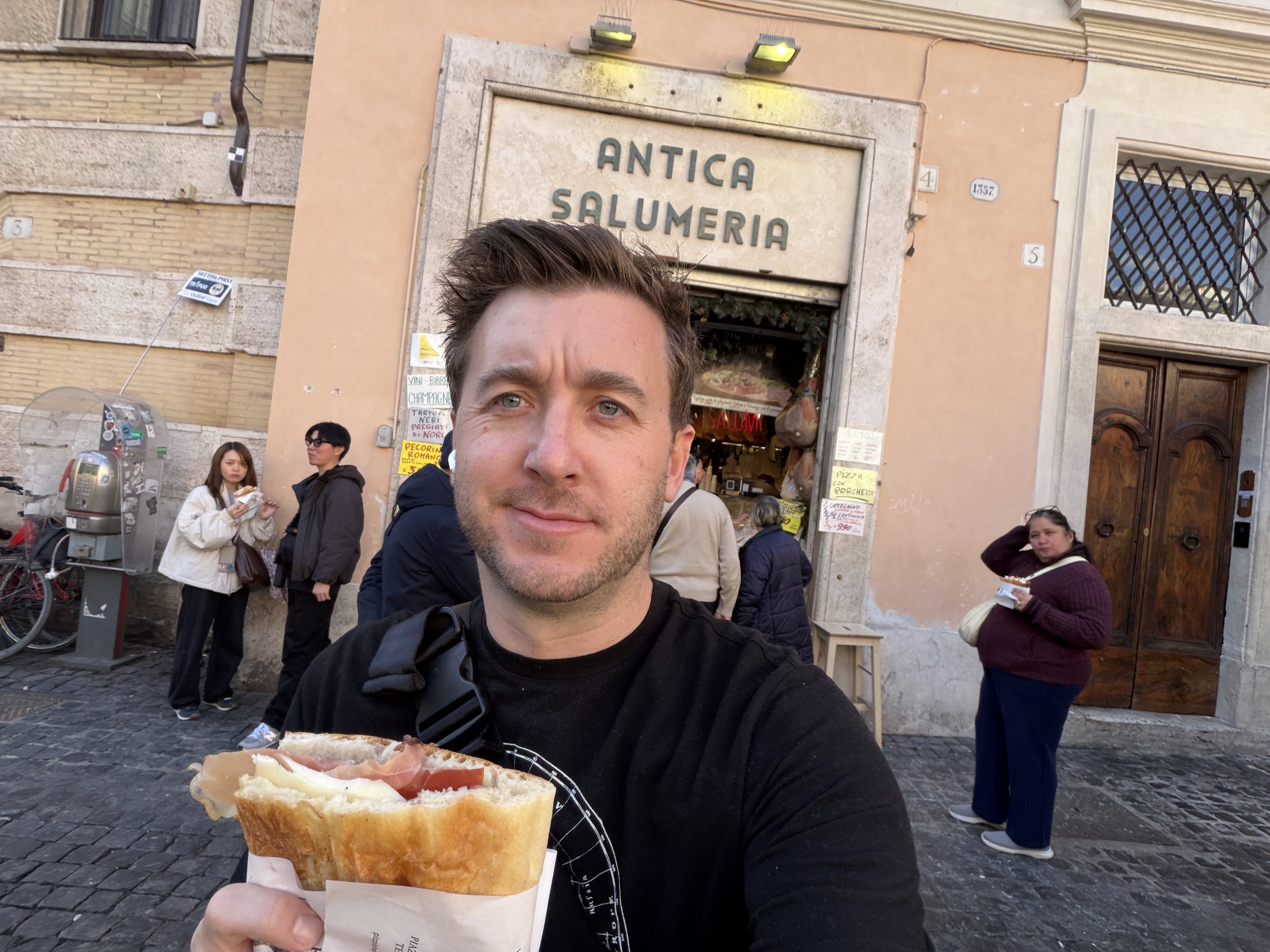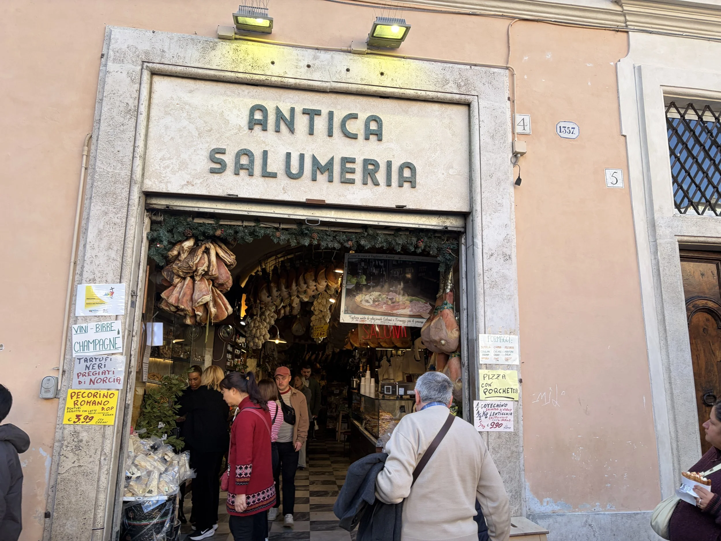 I was starving and on a mission for a prosciutto sandwich. I found Antica Salumeria near the Pantheon. I chatted with the staff, ordered some prosciutto and soft cheese, had it heated, and ate it while walking. A win.