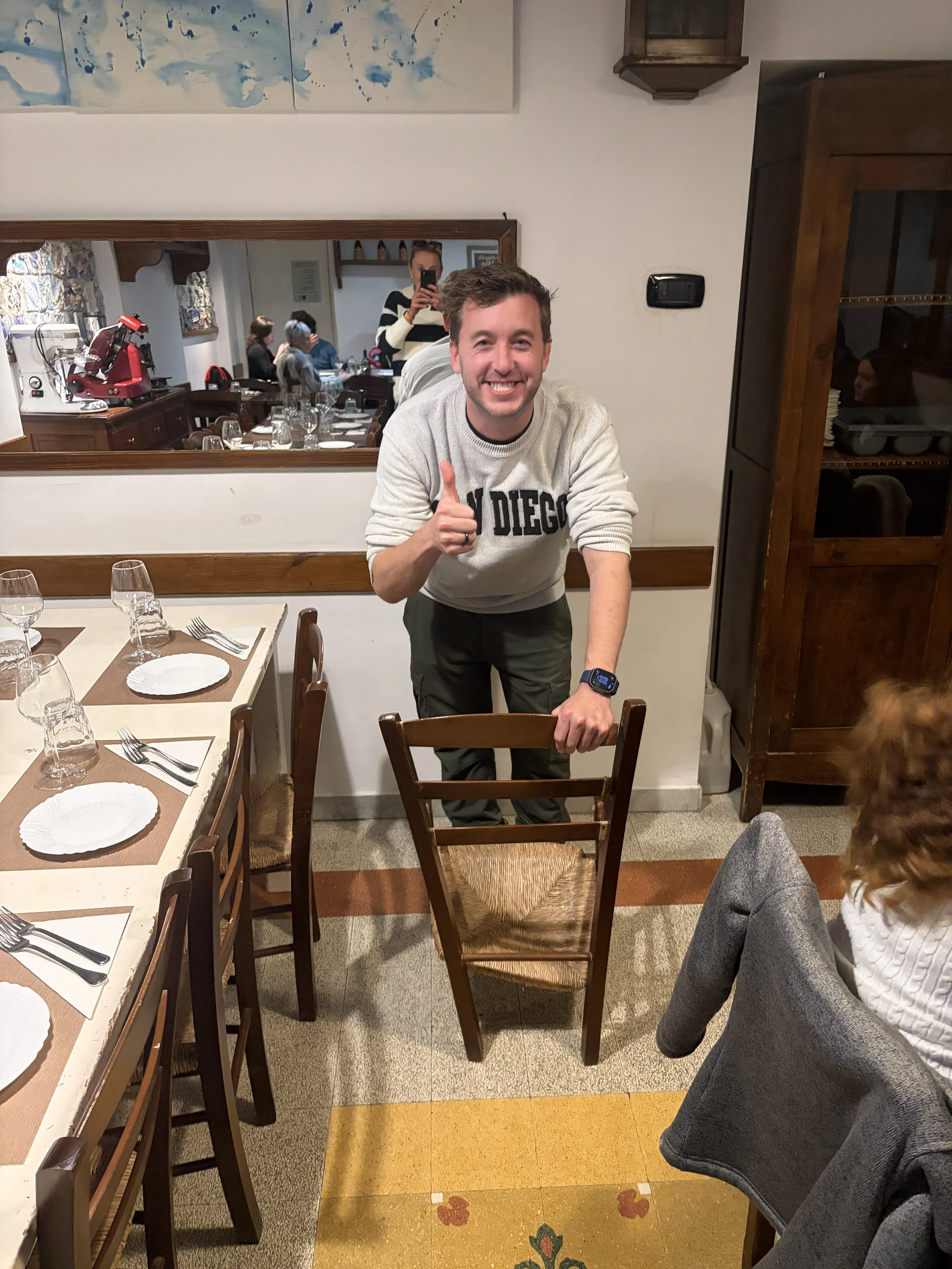 Dinner itself was pure chaos in the best way. By that point, we had stopped at four or five places, and every single one had poured wine. Low season meant a small group, but not smaller portions. We are talking about a bottle of wine split between two people at each stop. I sat next to the Scottish mom and the Atlanta couple and laughed nonstop. Pizza came out, then pasta, then more pasta just to make sure we were truly finished.
