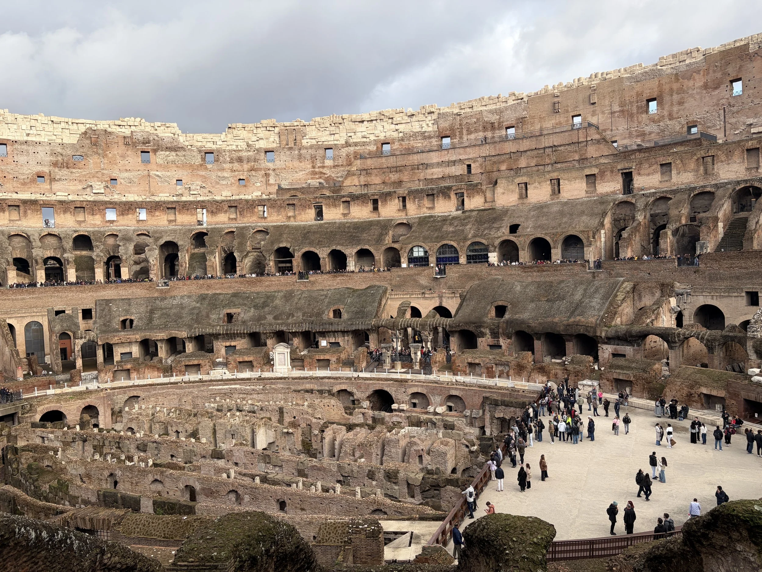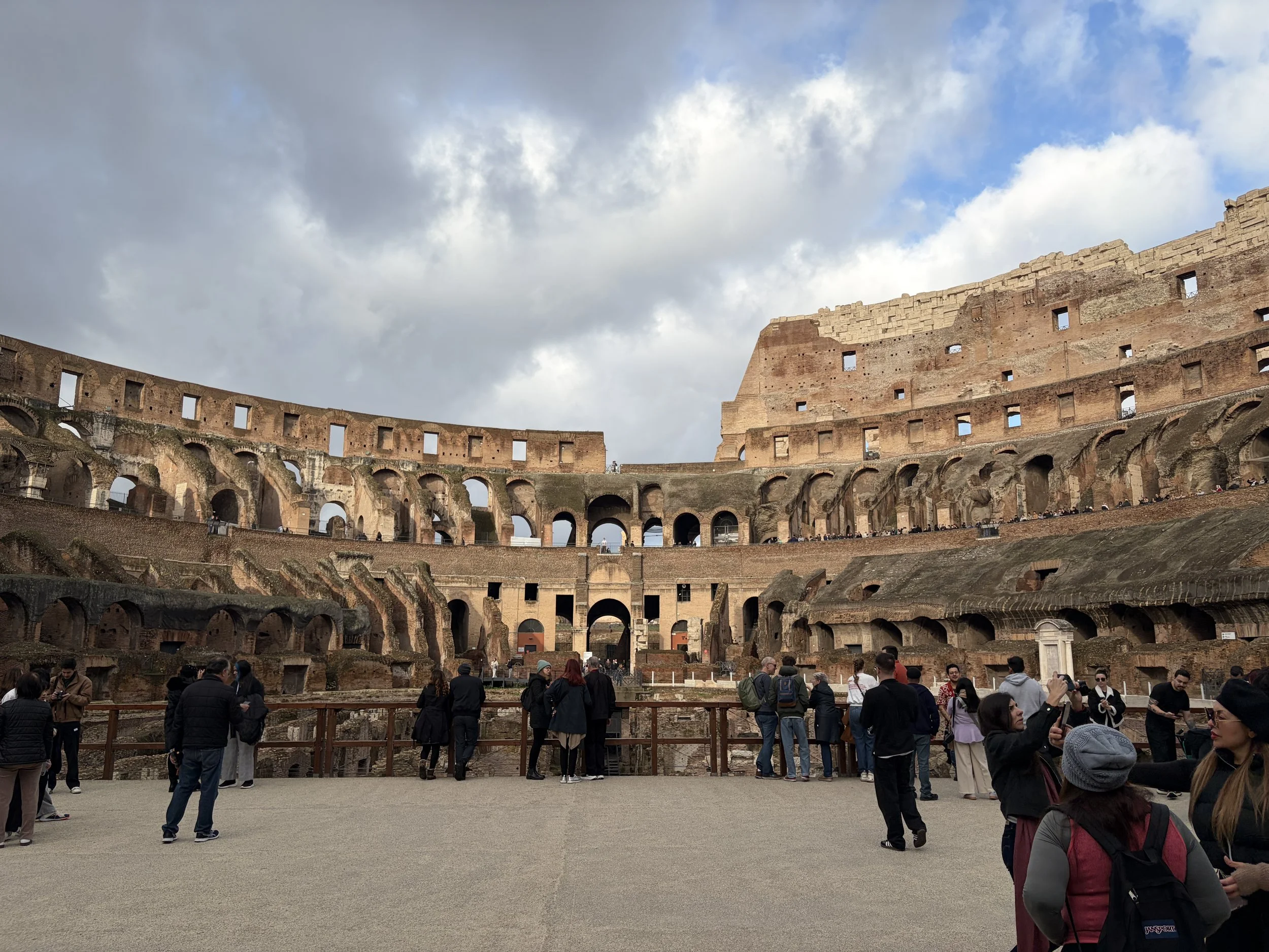 The next morning started with a freezing walk to the Colosseum, which is a massive amphitheater that once held around 50,000 spectators and hosted gladiator fights and executions. It dates back to around 80 AD, built during the reign of Emperor Titus. I had purchased my ticket in advance and was very glad I did as it was packed first thing in the morning. Just a heads up— there are all these shady “skip the line” gimmicks, but everything is times so there are no such thing. Just shady people trying to make a buck off your naivety.