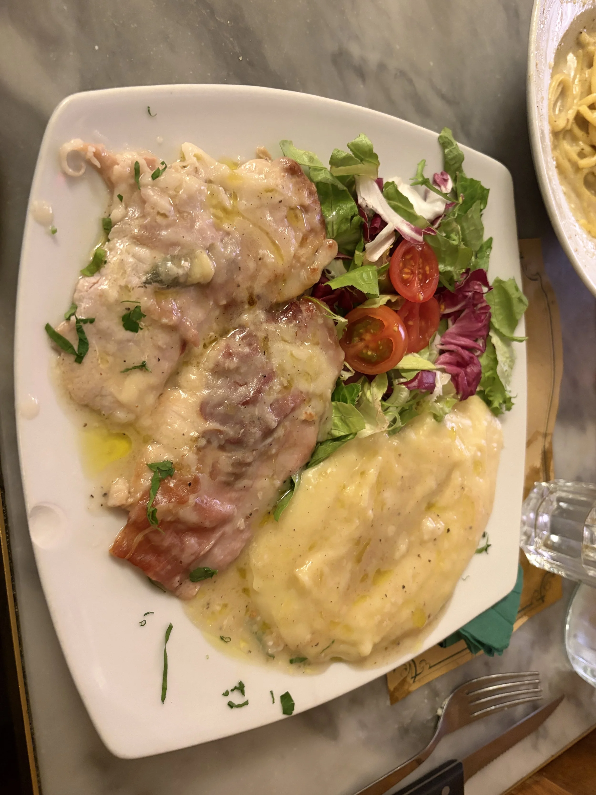 The food was better but still not great. I ordered carbonara and saltimbocca, and while everything looked beautiful, the flavors just didn’t deliver. I didn’t eat everything, so they came over and asked if everything was okay. Maybe it was the lack of wine, or maybe the night before had simply set the bar too high, but at this point, I was on a bit of a culinary losing streak.