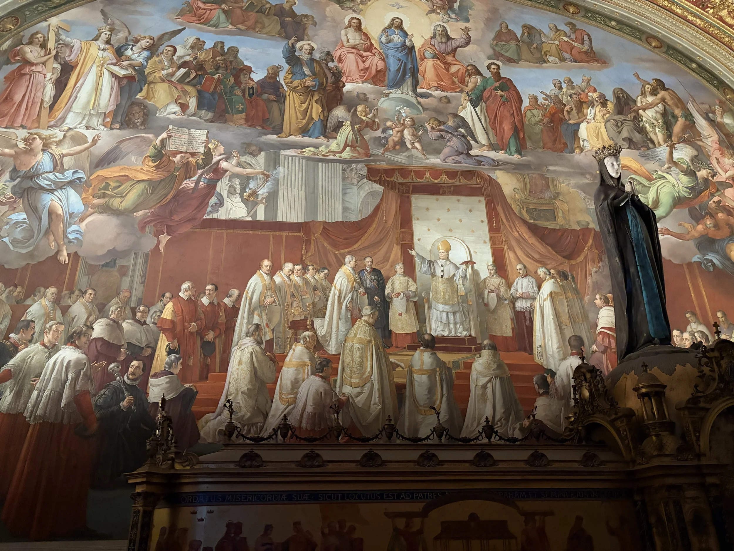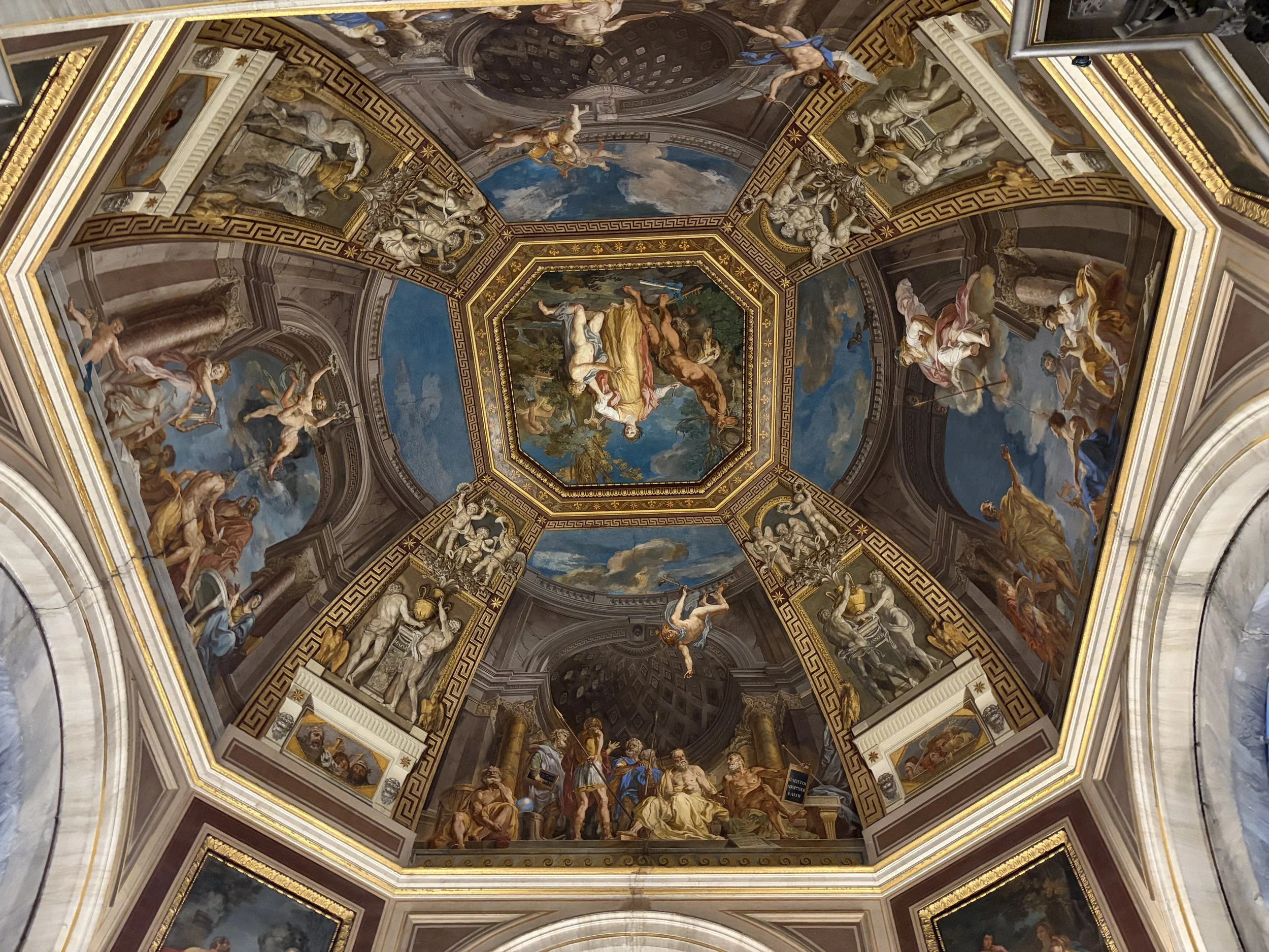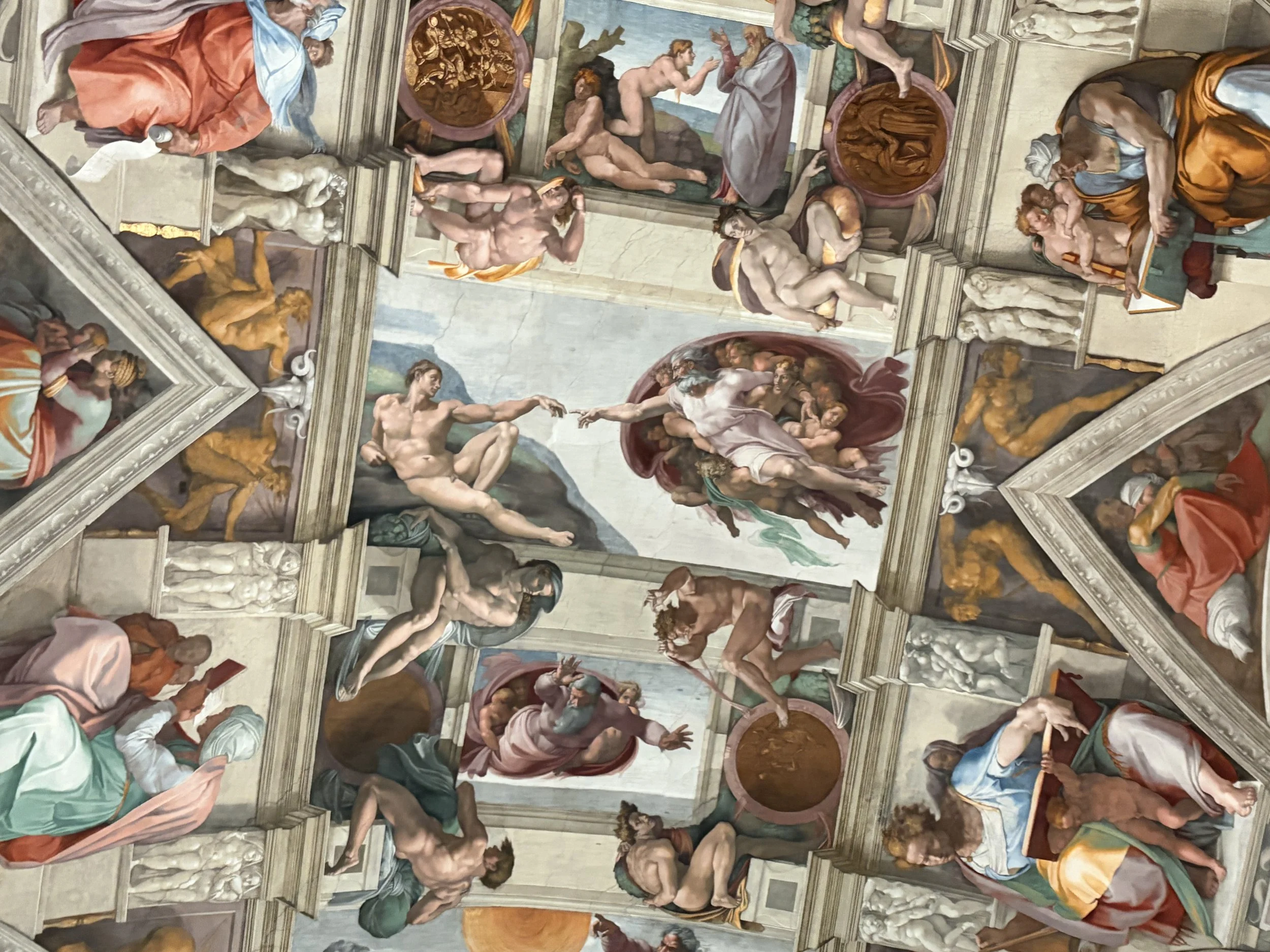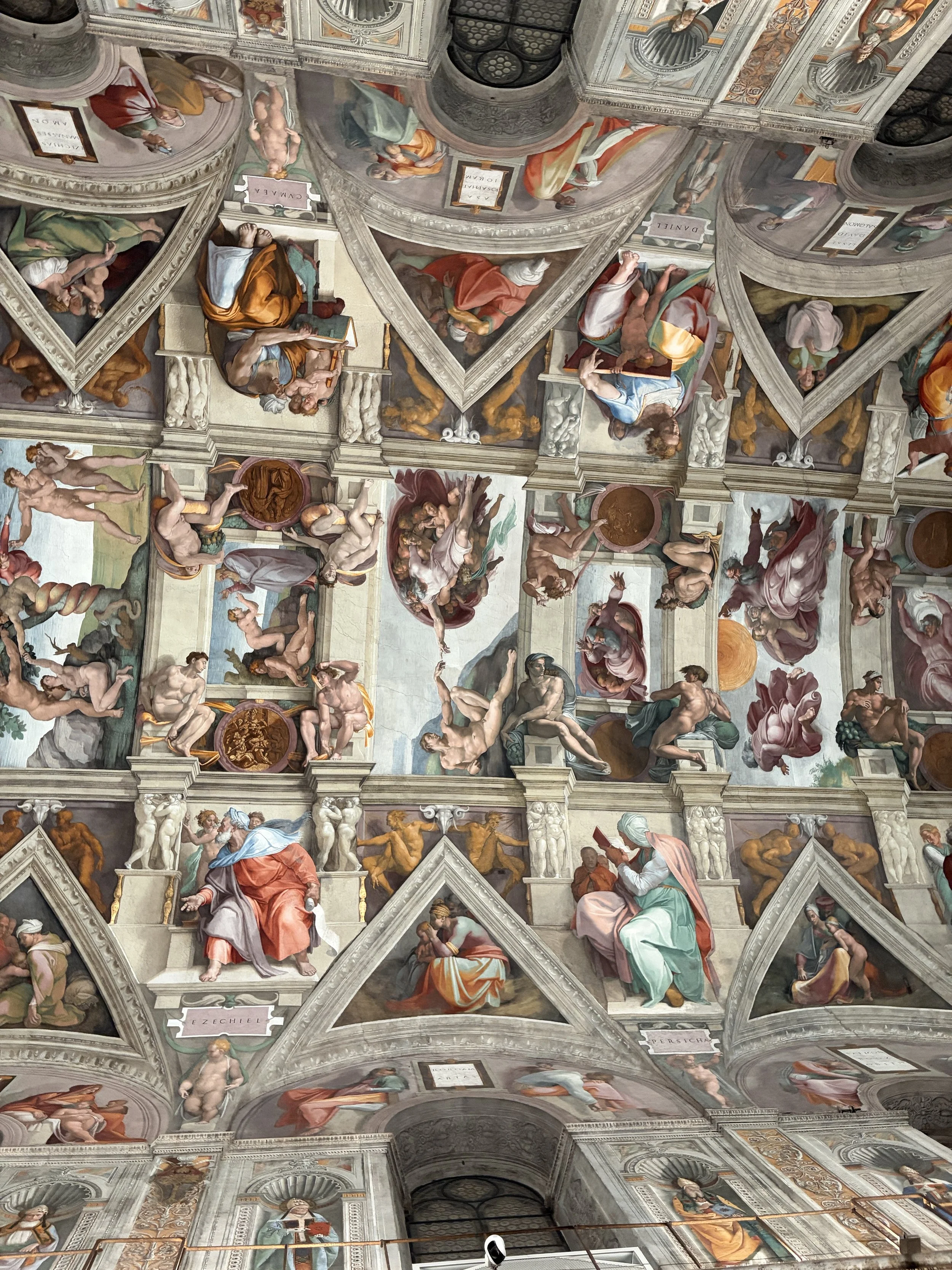 The grand finale — the pièce de résistance — is the Sistine Chapel. It’s famous for Michelangelo’s ceiling, particularly The Creation of Adam, where God and Adam reach toward each other with nearly touching fingers. Seeing it in person is genuinely striking, even with guards constantly reminding everyone to be quiet and not take photos. No matter how many times you’ve seen it reproduced, it still lands.