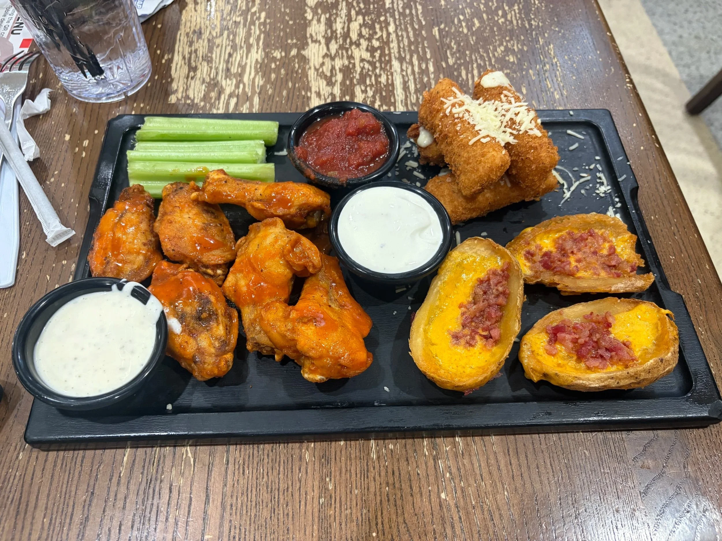 Atlanta, despite being the busiest airport in the U.S., somehow has a terrible food selection in the international terminal. I ended up at TGI Fridays. If mozzarella sticks are available, I’m good. I also got potato skins and wings so I was sitting pretty.