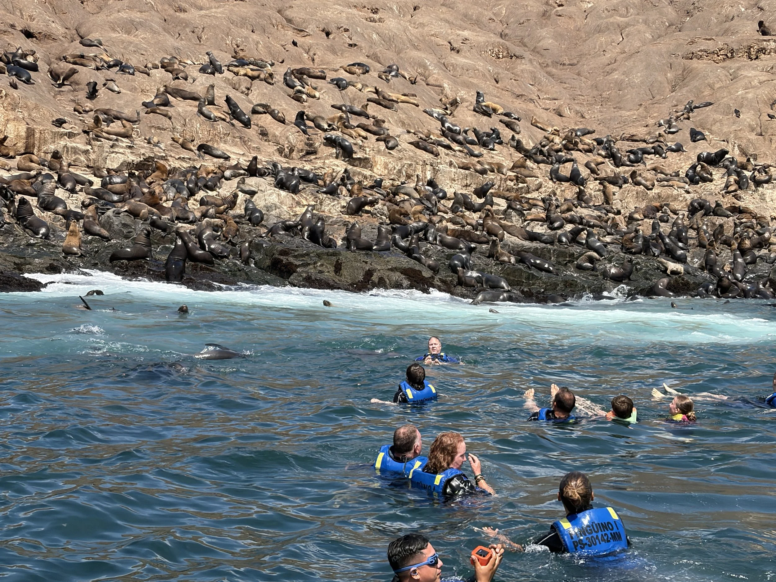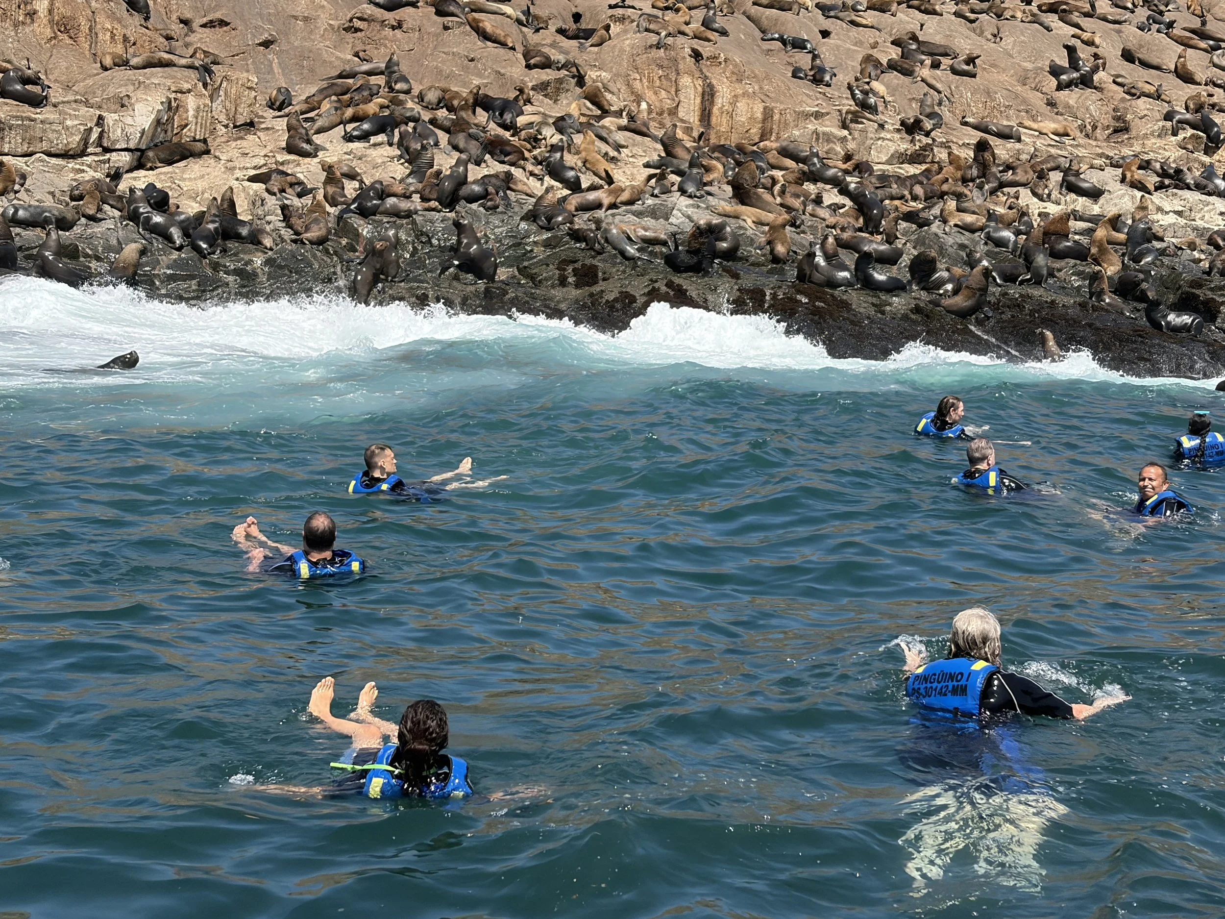 As we get closer, they start launching off the rocks and chasing the boat. Everyone is excited. I’m starting to connect dots that I really should have connected earlier. Then the wetsuits come out. And it hits me. We are getting in the water. With them. Here. Where they live. Not a controlled environment. Not a zoo. Not behind glass. Just… us, floating snacks.