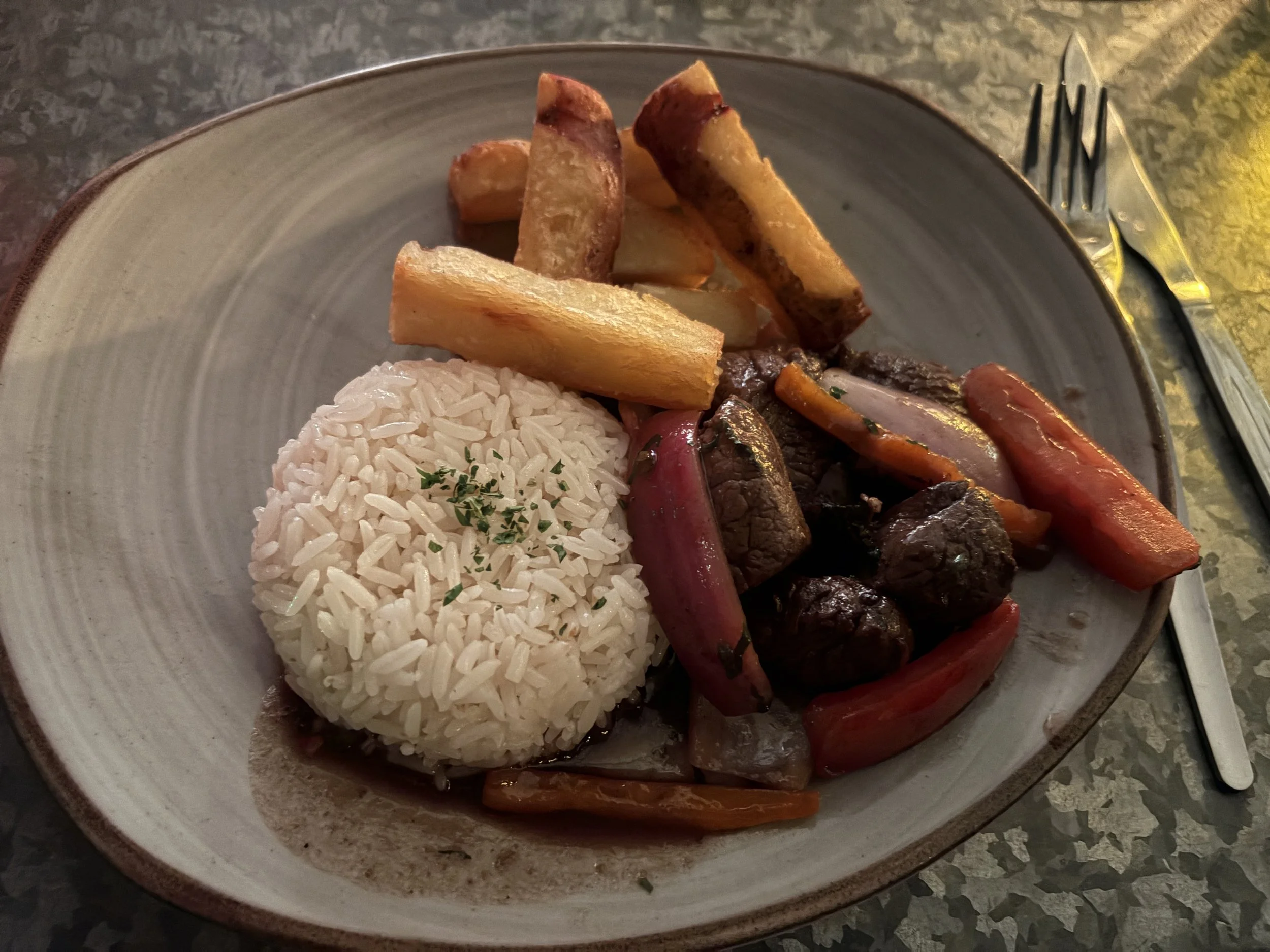 Next came a cooking demonstration focused on lomo saltado, a Chifa dish that blends Peruvian and Chinese influences—steak, rice, fries, soy sauce, and vegetables. It’s basically comfort food engineered for success. I was excited to try it, but that excitement took a sharp turn when they pivoted mid-demonstration and announced we would also be trying beef heart. They brought out large portions like this was completely normal, and everyone else seemed thrilled. I took a bite, and while the flavor wasn’t terrible at first, the texture was what got me—rubbery, chewy, and very hard to mentally commit to swallowing. Meanwhile, everyone else was inhaling it like it was their favorite dish. I was the only one who didn’t finish, and I was completely fine with that decision. Fortunately, they followed it up by serving the lomo saltado we had just watched them prepare, and it was a full, generous portion. At that point, I was starving, so this felt like a much-needed recovery.