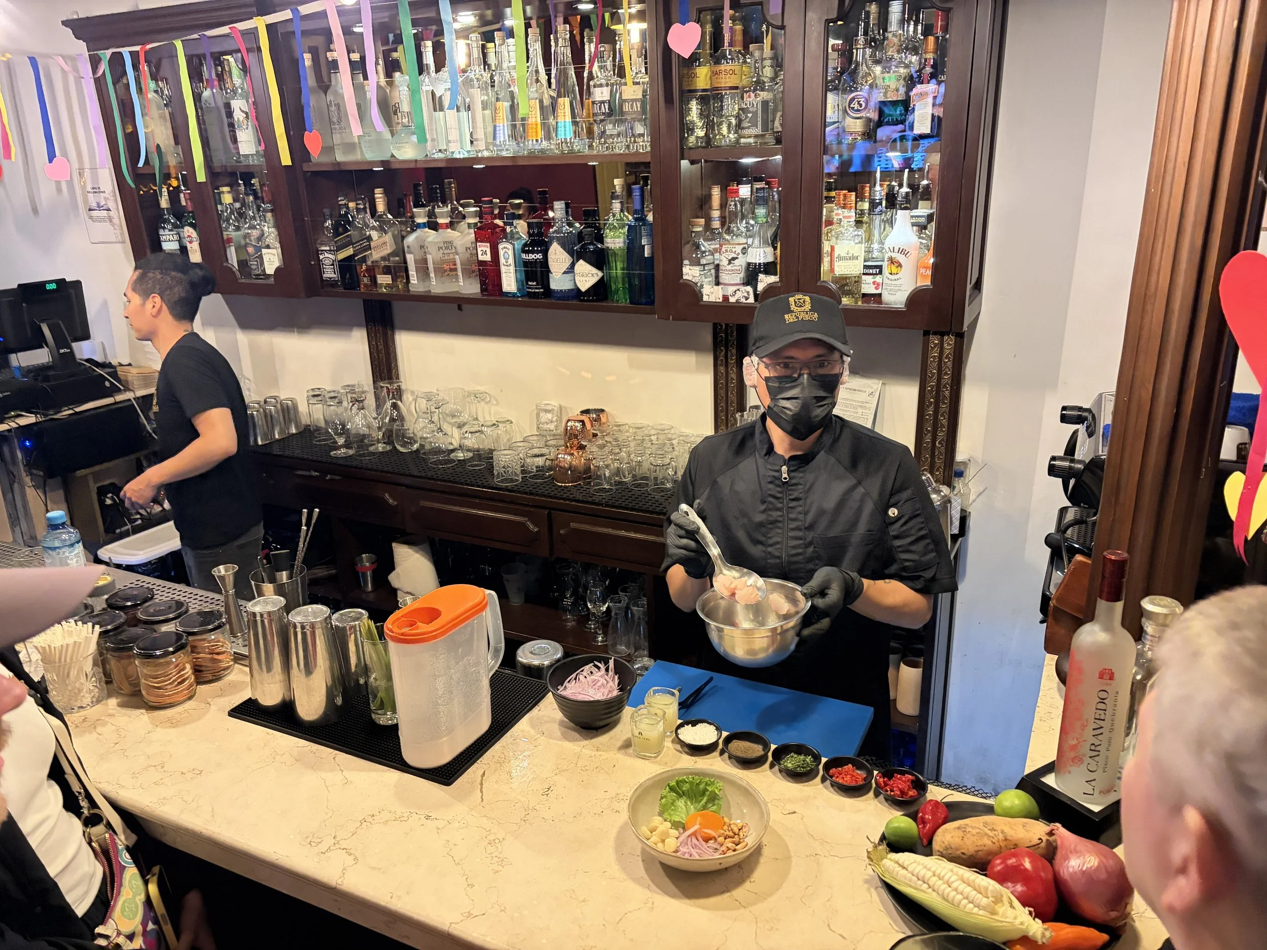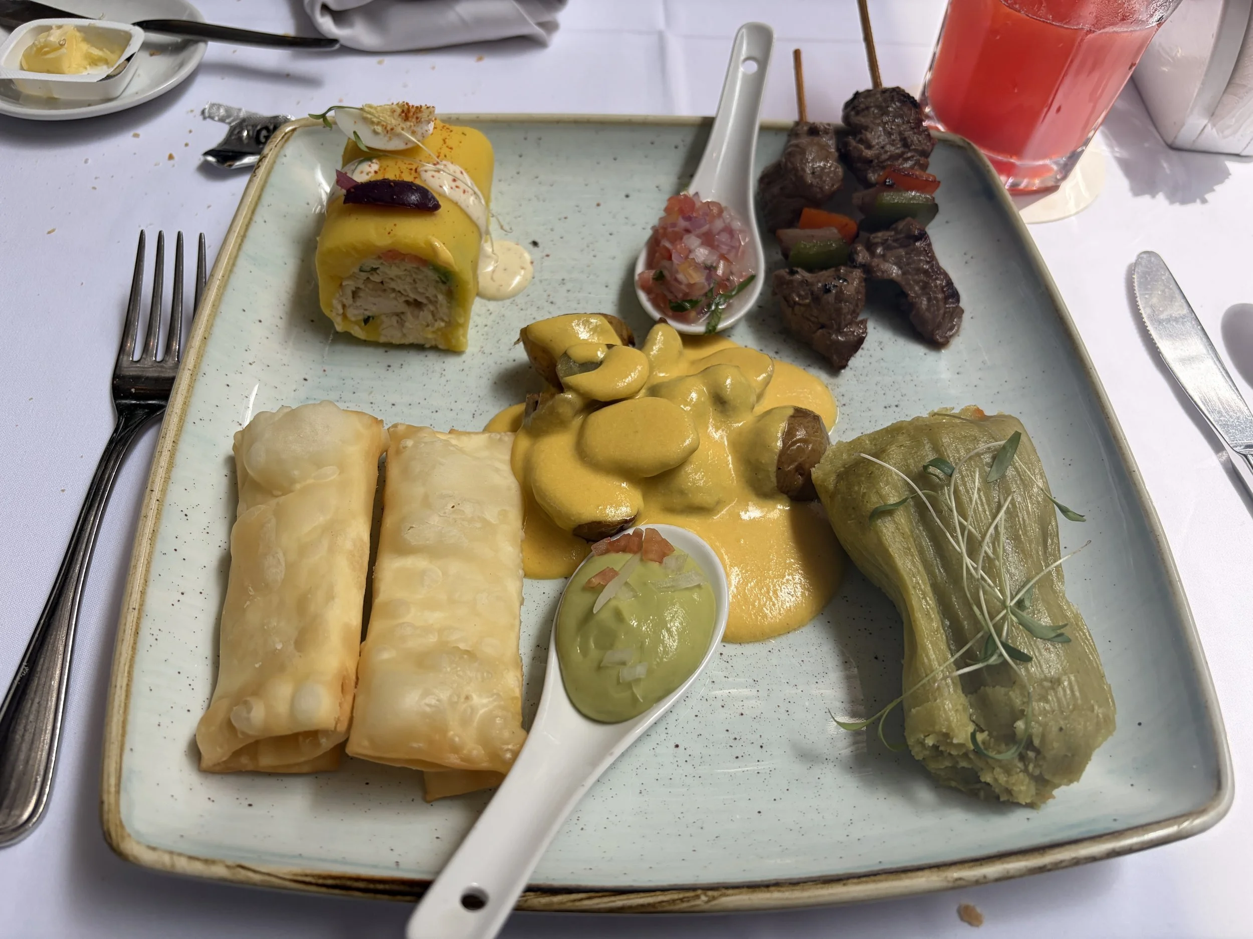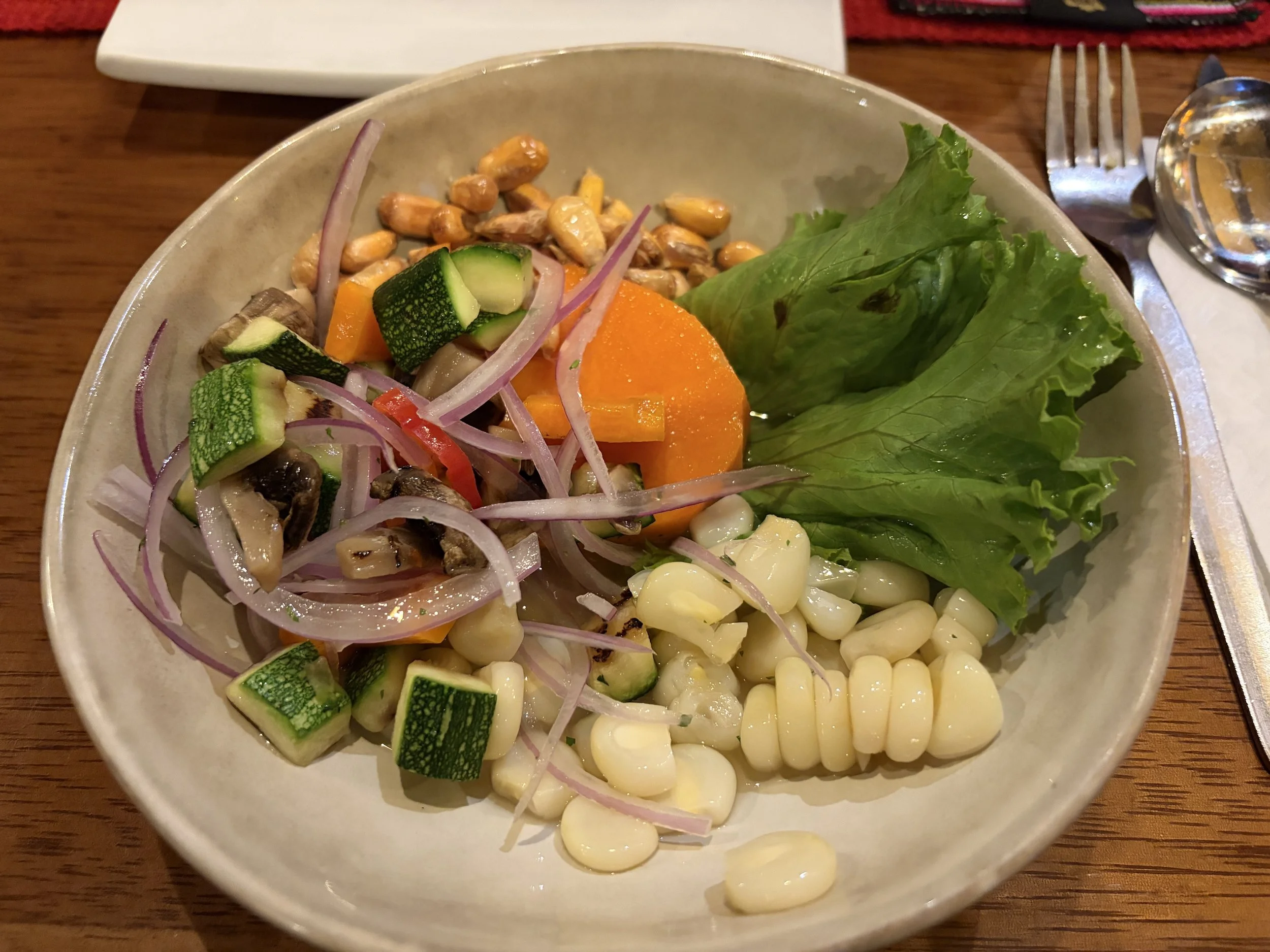 The next stop was ceviche, which required a bit of coordination given my stance on seafood. I had told the tour company ahead of time that I don’t eat seafood, and when we started the tour the guide tried to clarify exactly what that meant. She went through what felt like 30 different fish options, and I kept saying no until I finally simplified it: if it lives in the water, I’m not eating it. By the time we got to the ceviche restaurant, she pulled me aside and told me the chef would make a vegetarian version just for me. I ended up with potatoes, avocado, sweet potato, and corn instead of fish, and honestly, I couldn’t have been happier with that outcome.