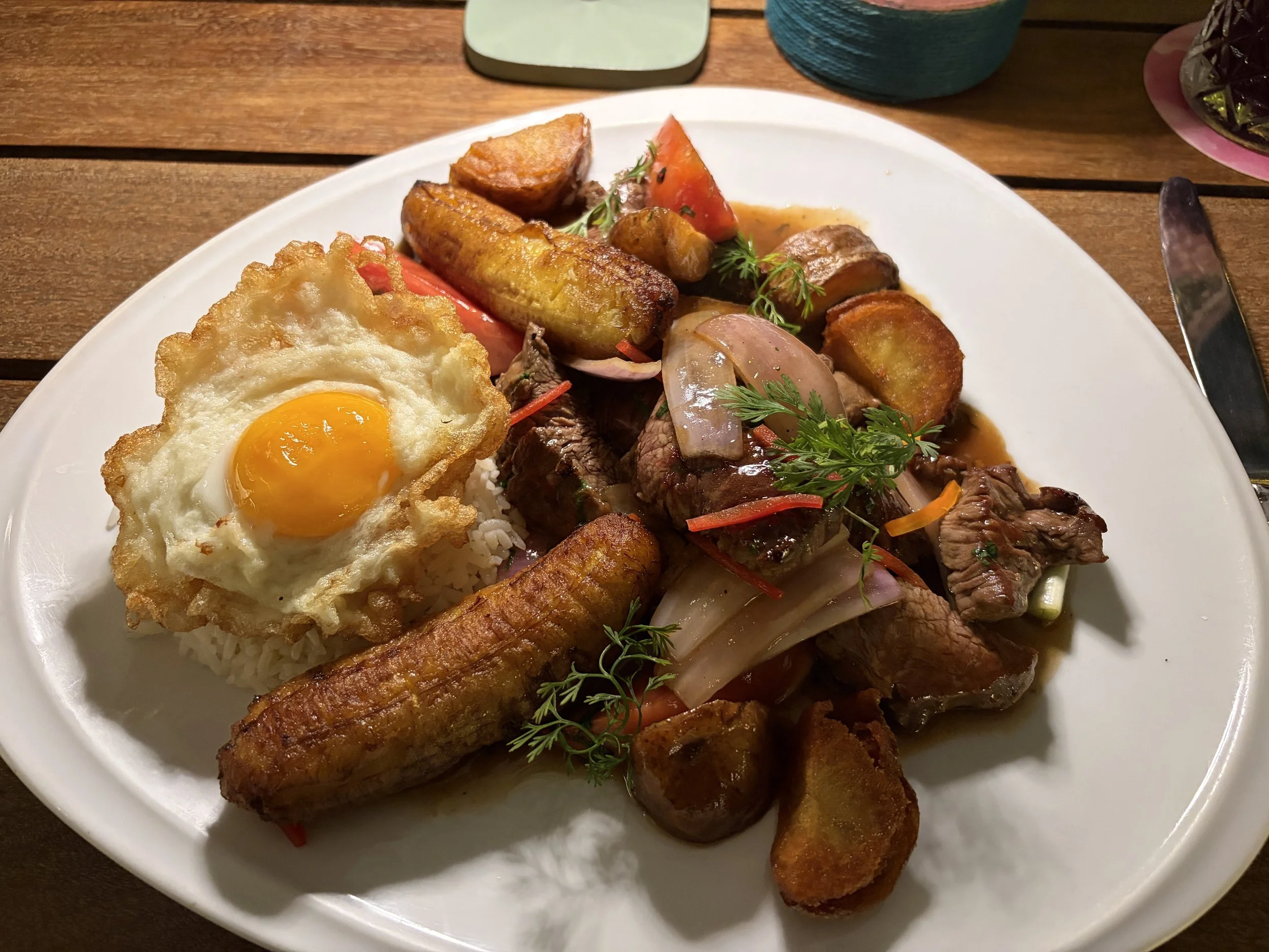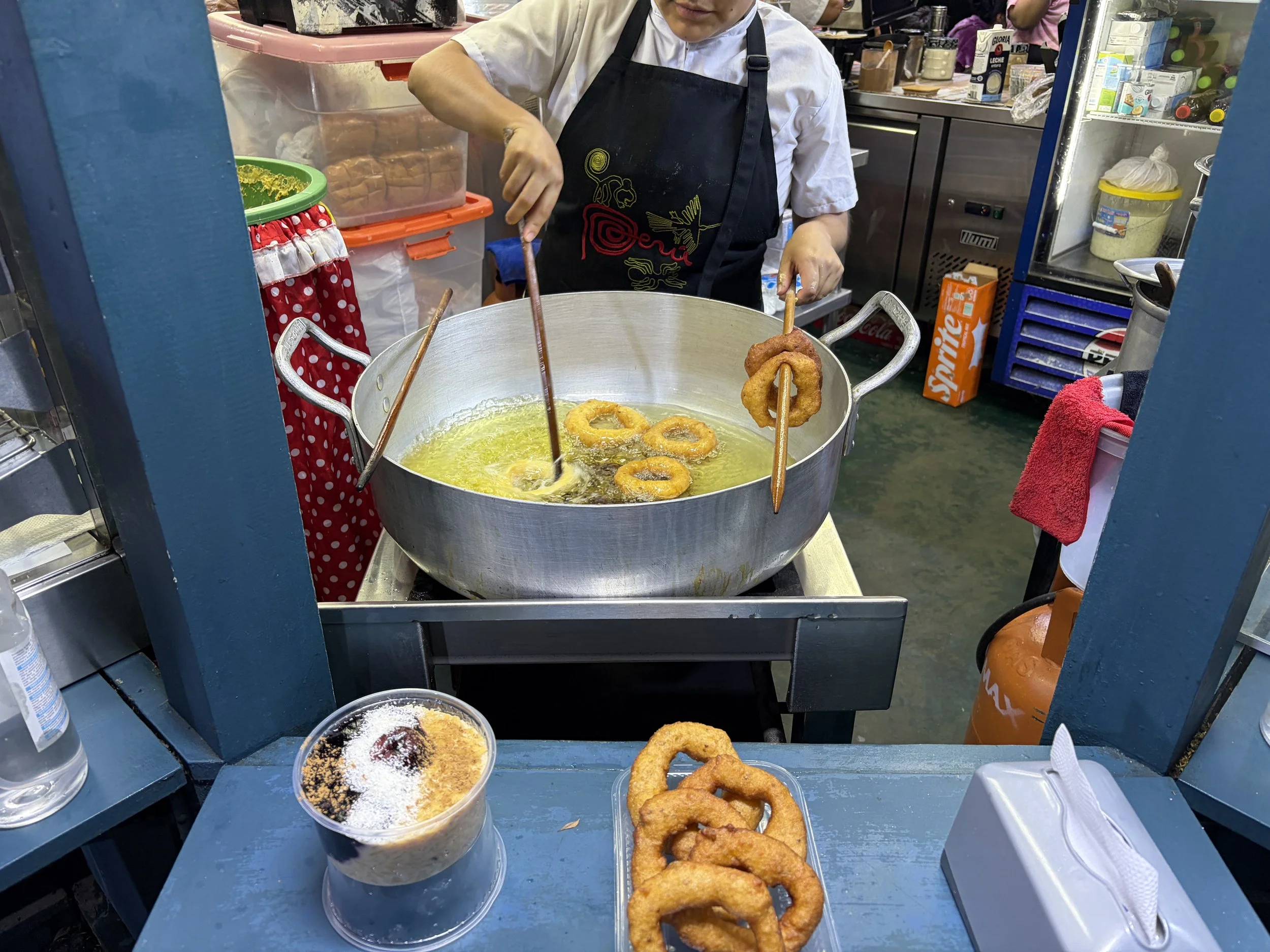 We started with what was labeled “breakfast” at a place called Luna Nuevo, which consisted of coffee and a chicken empanada. The coffee made sense—classic breakfast—but the chicken empanada felt like a bold interpretation of the concept. This was also where I knowingly tried aji amarillo for the first time, the yellow chili pepper that is basically in everything in Peru. It’s hard to describe, but it’s kind of like their version of a mild curry—flavorful, slightly sweet, and not overwhelmingly spicy. As it turns out, I had already eaten it earlier with my fries at lunch and just didn’t realize it at the time.